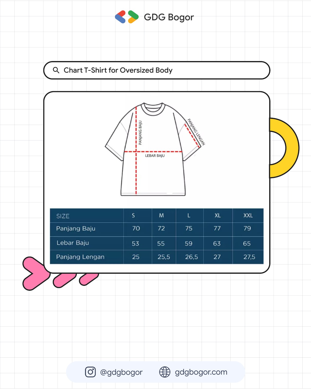 Panduan ukuran kaos DevFest Bogor 2025 (S–XXL, unisex).
